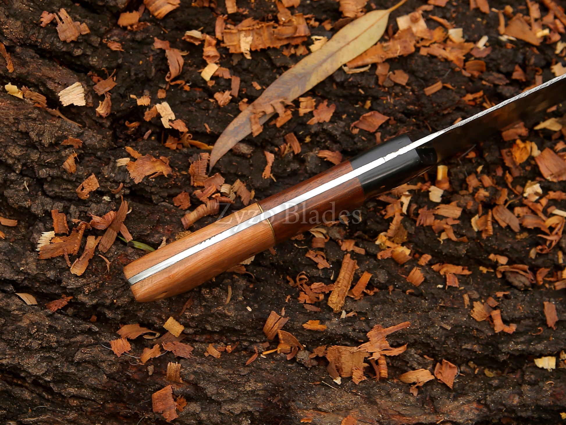 Our knives are 100% hand forged from premium high carbon steel which results in a high carbon content blade and long lasting edge retention. High carbon Damascus steel blades will begin to form a patina (a slight color change) with use which helps to stabilize freshly forged blades and become more rust resistant overtime