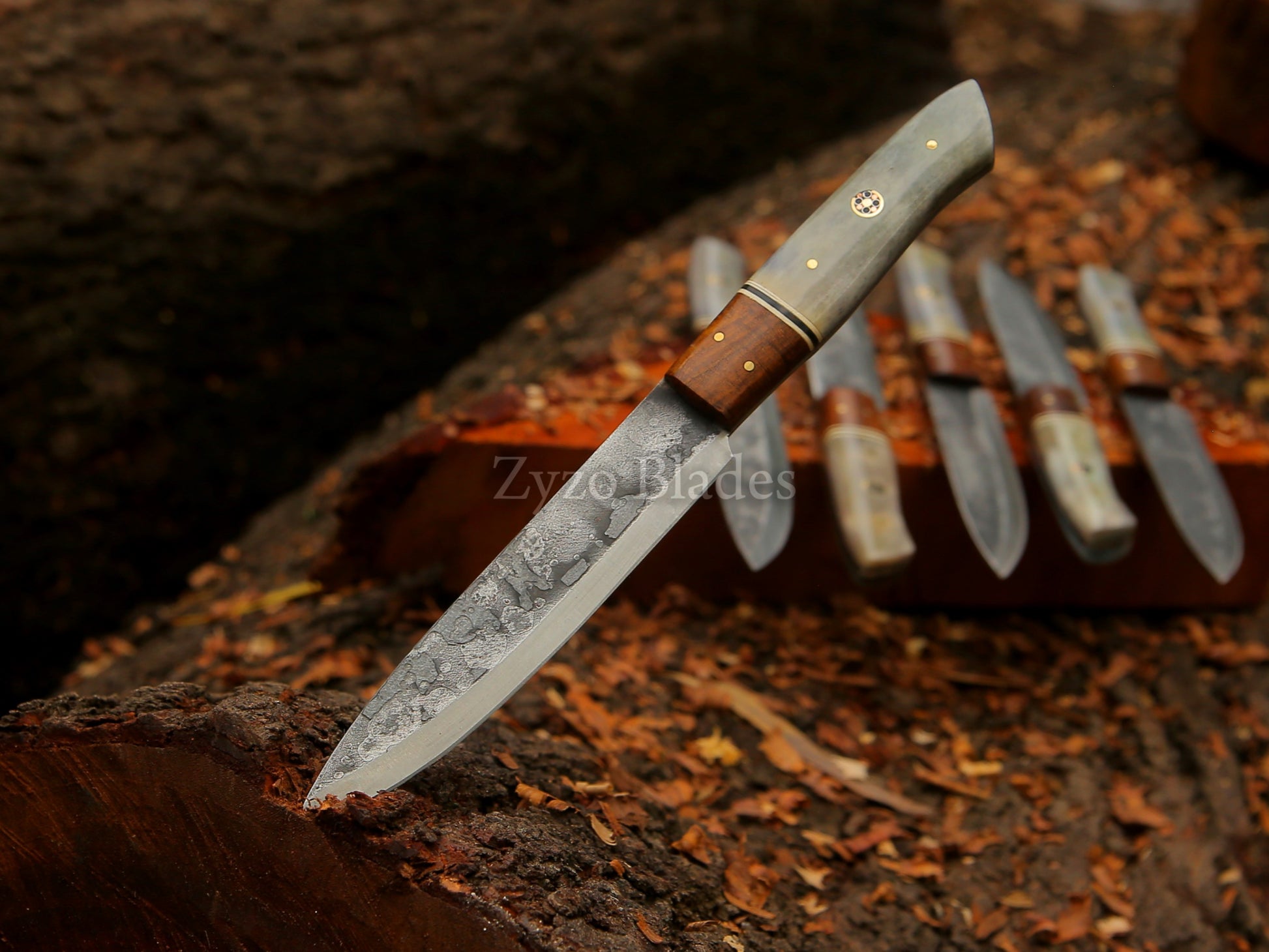 Our knives are 100% hand forged from premium high carbon steel which results in a high carbon content blade and long lasting edge retention. High carbon Damascus steel blades will begin to form a patina (a slight color change) with use which helps to stabilize freshly forged blades and become more rust resistant overtime